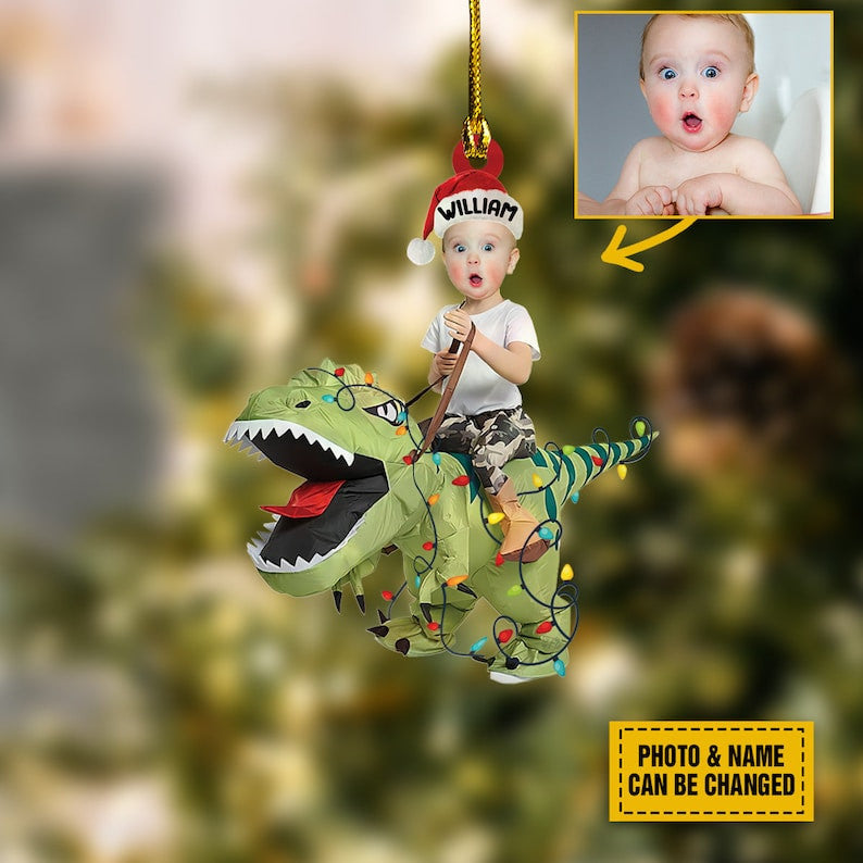 Cute Kid Rides The Dinosaur Kid Photo 2d Flat Ornaments, Christmas Gift, Custom Photo Ornament, Funny Ornament, Holiday Decors, Xmas Decors